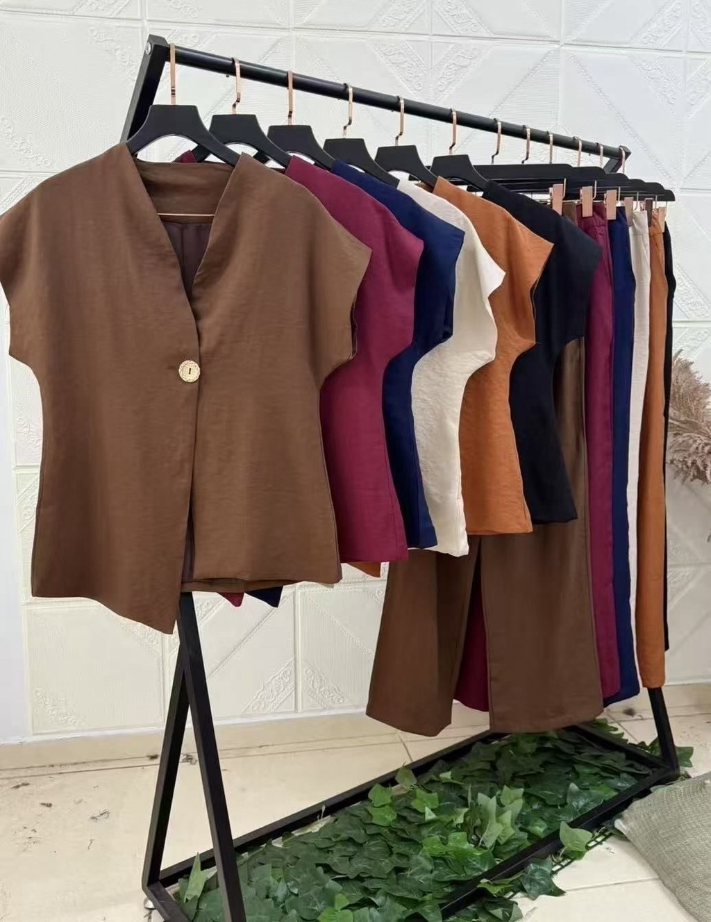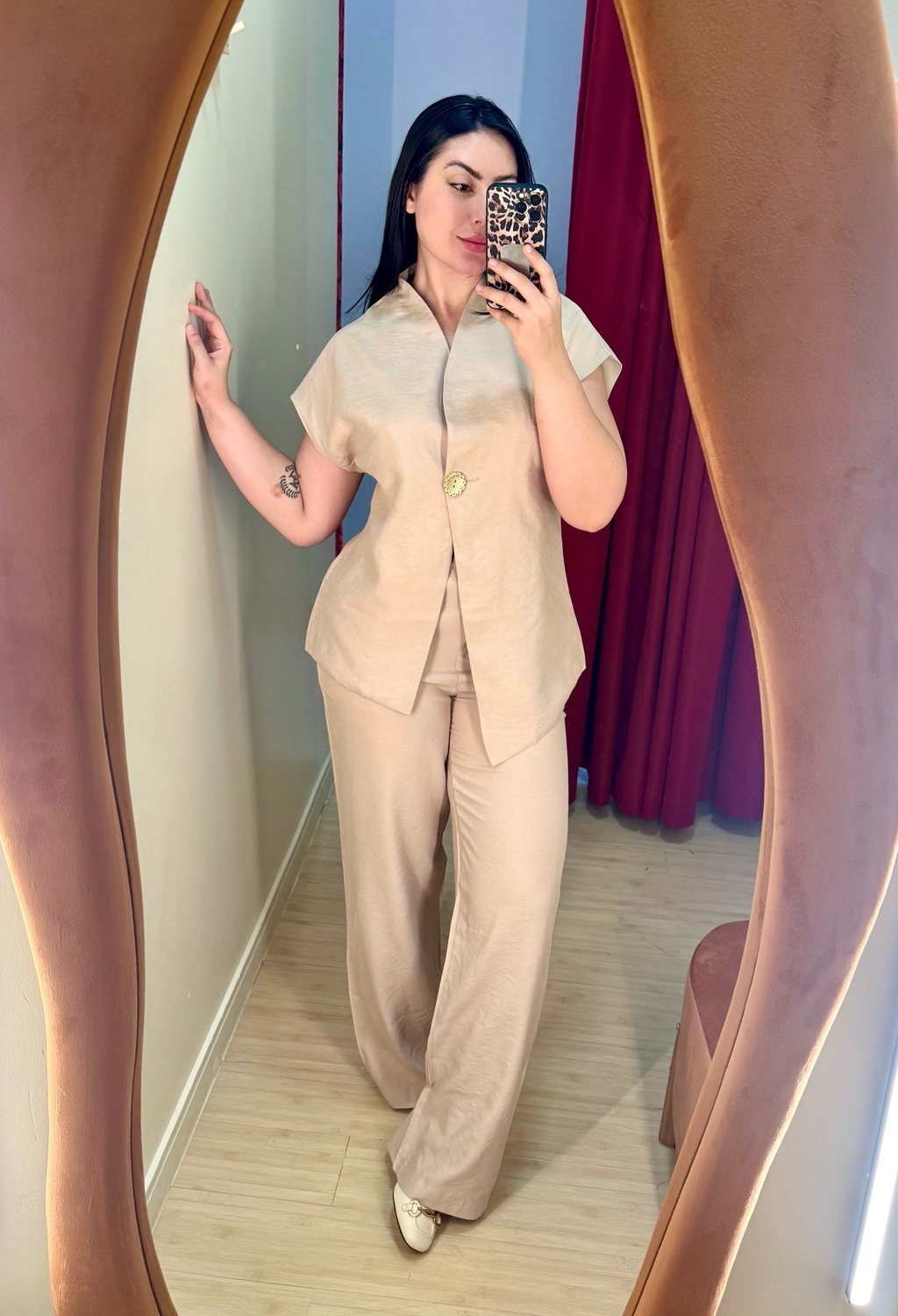 Conjunto blusa e calça na viscose, blusa Max de usar mais solta com detalhe assimétrico.