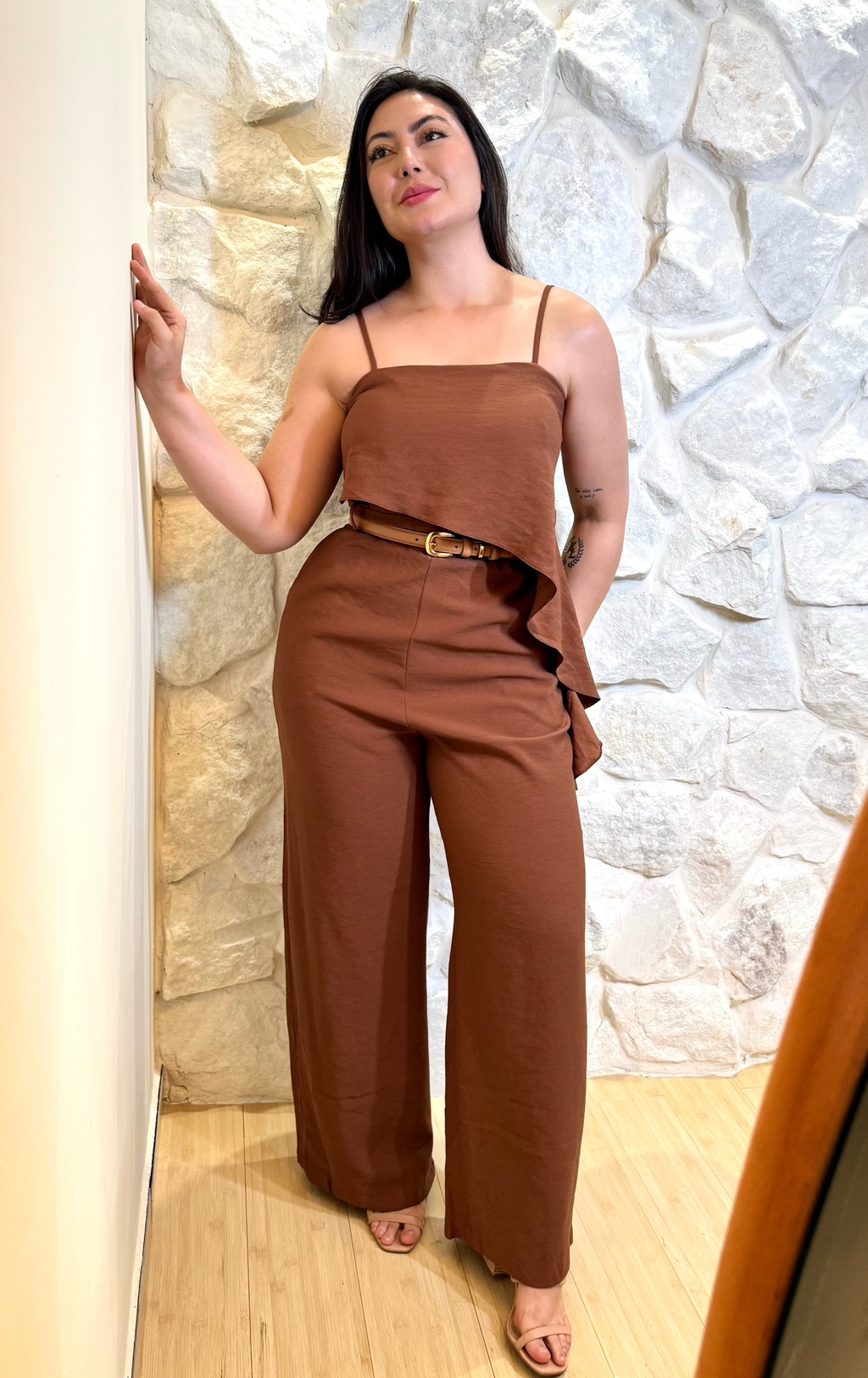 Macacão todo em viscose, alça regulável e elástico nas costas.